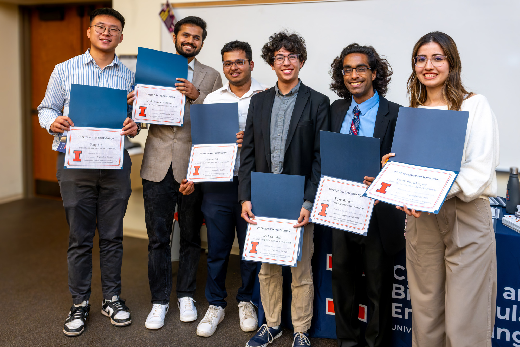 2025 Graduate Research Symposium winners, left to right: Song Yin, Ankit Gautam, Ashwin Bale, Michael Taleff, Vijay Shah, Feray Buyuktopcu