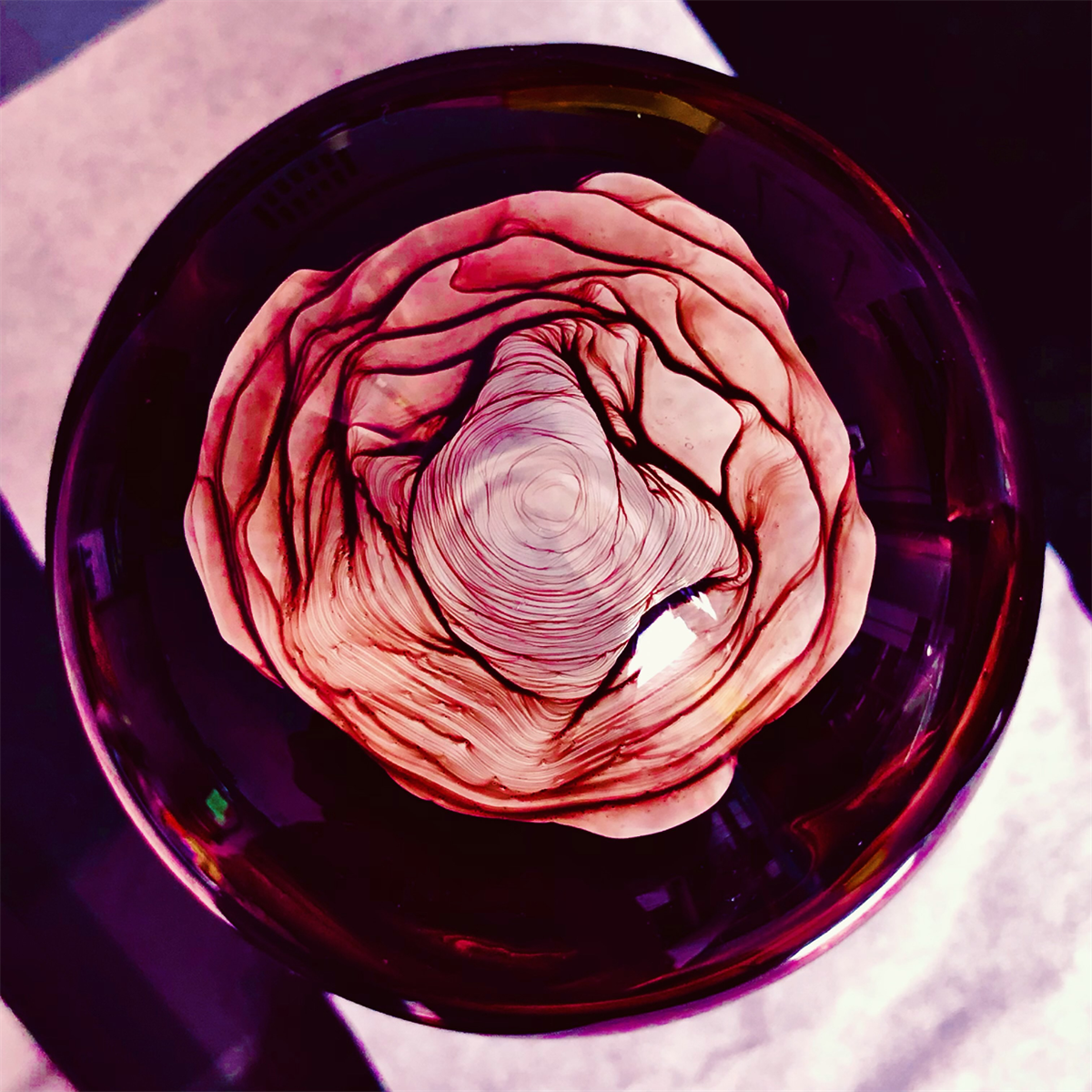 Some roses grow from flowerbeds, and others appear in chemistry labs. This rose-like hue and pattern formed at the bottom of a flask as dichloromethane solvent evaporated from an aromatic compound sample. The polycyclic aromatic hydrocarbons show useful electronic properties and also imparts color.