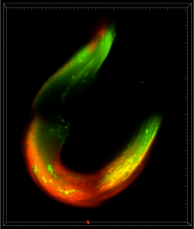 The fluorescent image represented a 3D engineered muscle bundle composed of mouse skeletal muscle. The image was acquired with the Lightsheet Z1 system in Carl R. Woese Institute for Genomic Biology.
