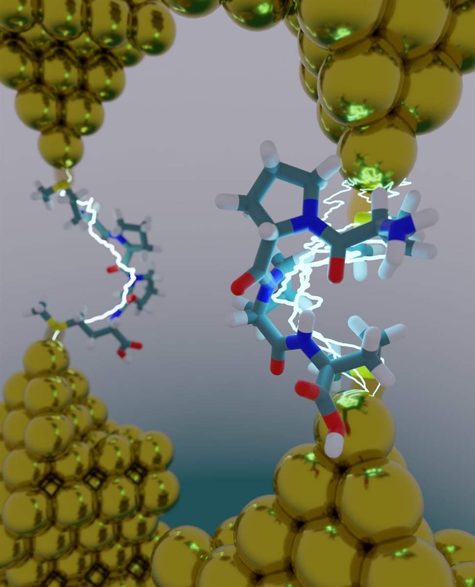 An atomistic model of a molecular break junction: an oligopeptide is caught between two gold electrodes, forming a single-molecule circuit. Using a combined experimental- computational approach, we show that secondary structure plays an important role in determining electron transport in peptides. Image rendered using VMD and Blender