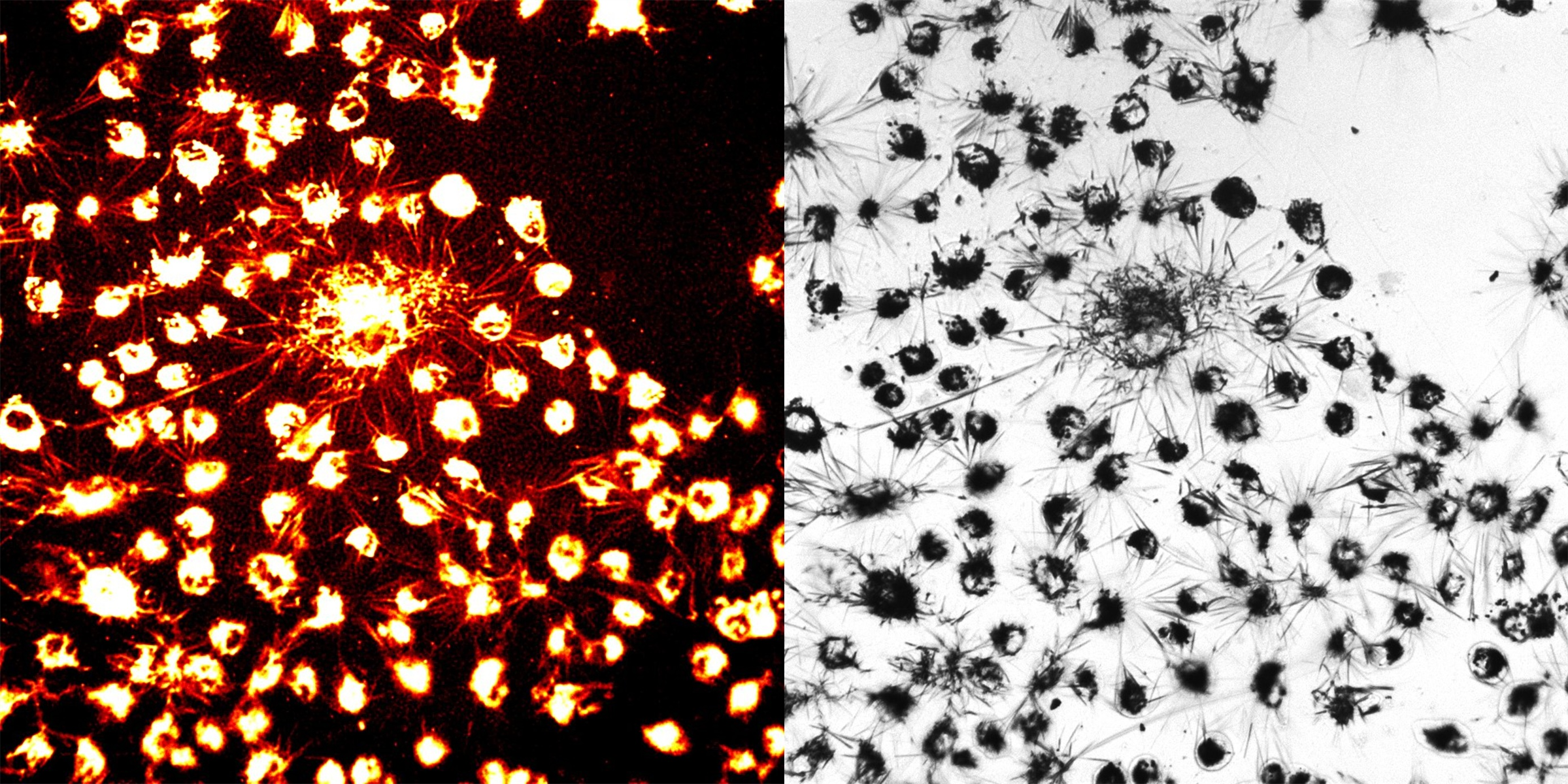 What may appear as a spider web or fireworks illuminating the sky are indeed formazan crystals formed within living cells through the action of mitochondrial enzymes. While this process is employed to evaluate the cellular toxicity of chemicals, it showcases the intersection of biology and art through microscopy