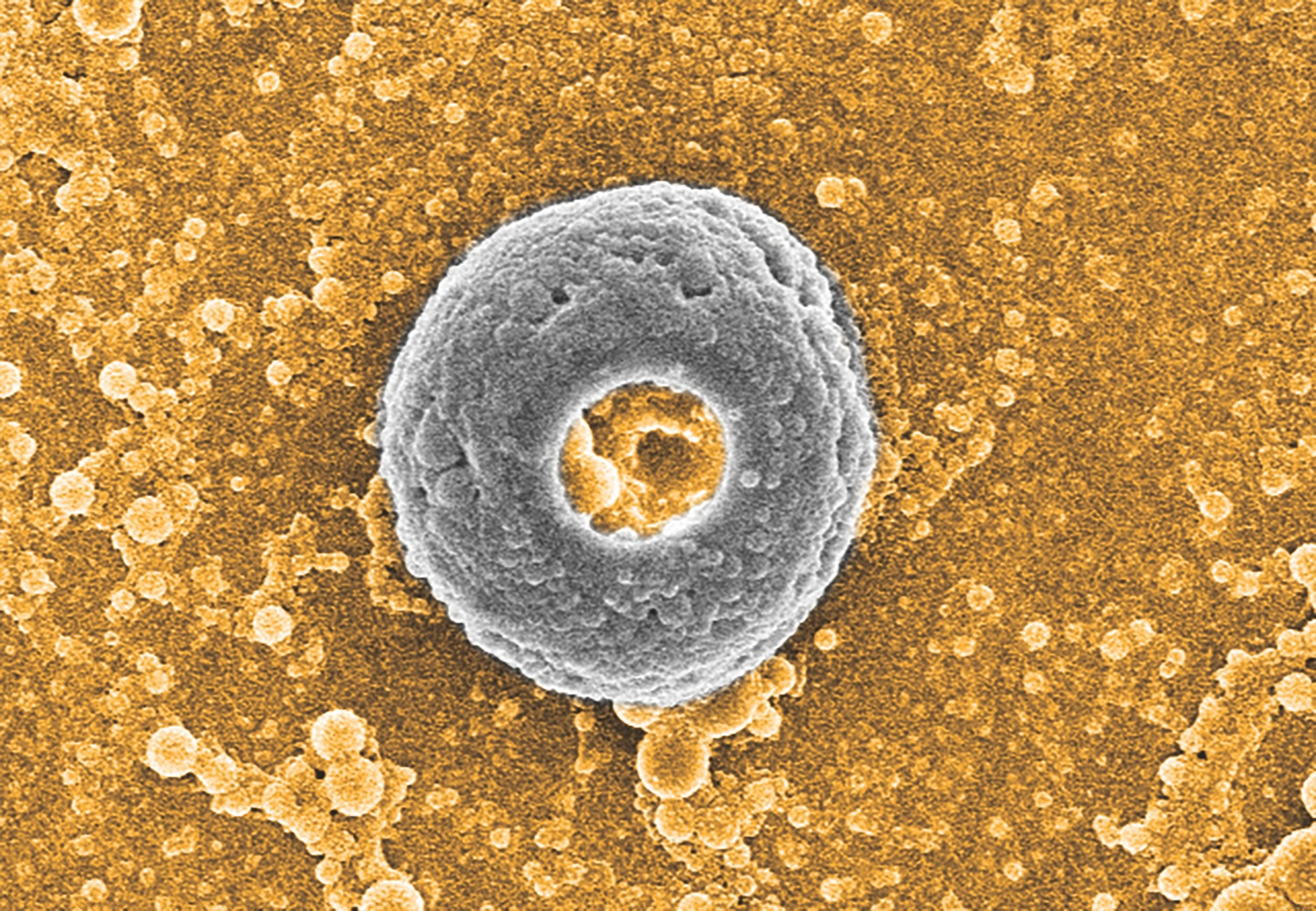 Polymer electrolyte complexes can form particles with diverse shapes like bread dough. The electron microscopy image shows an uncommon donut-shaped (or toroidal) particle surrounded by spherical nanoparticles formed when drying the polymer electrolyte mixtures. Image obtained at the Materials Research Laboratory Facilities