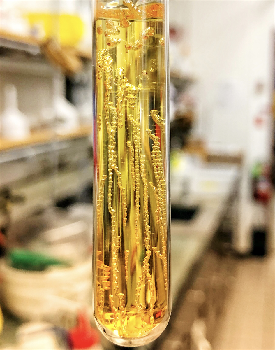 The “golden necklace” pattern was formed because of trapped air and water pockets during frontal ring-opening metathesis polymerization, an energy-efficient technique for fabricating high-quality thermosets and composites used in engineering applications