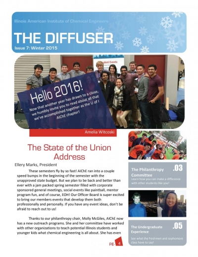 The Illinois chapter of the American Institute of Chemical Engineers had a busy fall semester and is looking ahead to an exciting 2016. Read about their activities in The Diffuser, the group’s newsletter. Learn about the mentor program that connects upperclassmen and underclassmen. Get an update on activities such as visits to grade schools, upcoming sports competitions, and more!