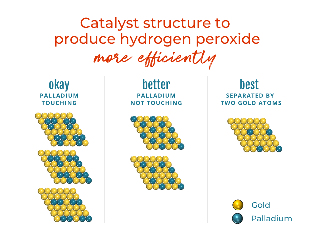 The organization of these atoms within the catalyst also counts: palladium atoms touching one another favor water formation, while palladium atoms surrounded by gold favor H2O2 formation.
